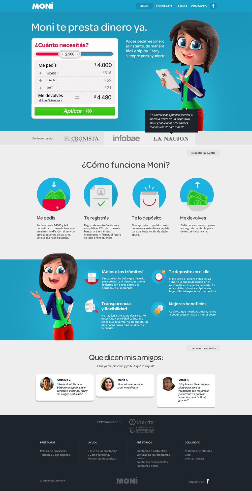 Trabajamos junto al cliente para llevar adelante un site de prestamos online, desde el nombre, personaje y comunicación adecuada a las ventajas diferenciales del servicio. A diferencia de una campaña, en este caso es un proyecto digital ongoing de servicio que continuamente esta evolucionando.