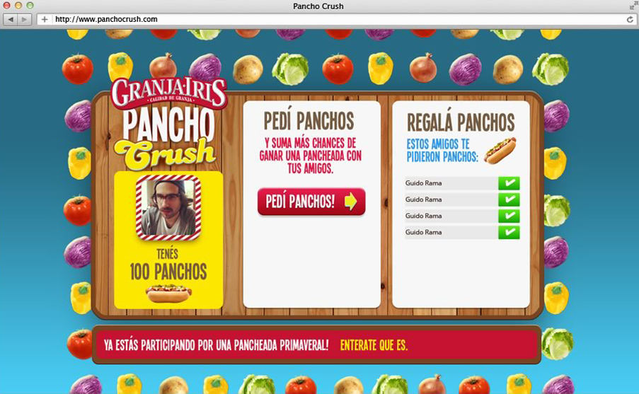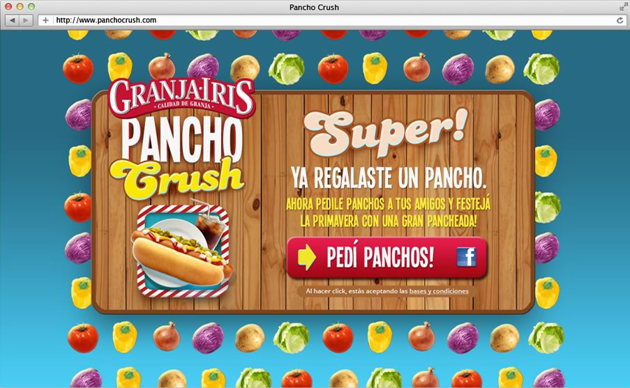| Aprovechando el momento de auge del juego Candy Crush, llevamos adelante una acción en la que la que invitamos a los participantes a dejar a un lado el pedido de vidas de Candycrush, para empezar a pedir panchos. El ganador recibió una pancheada de premio para disfrutar con amigos. |